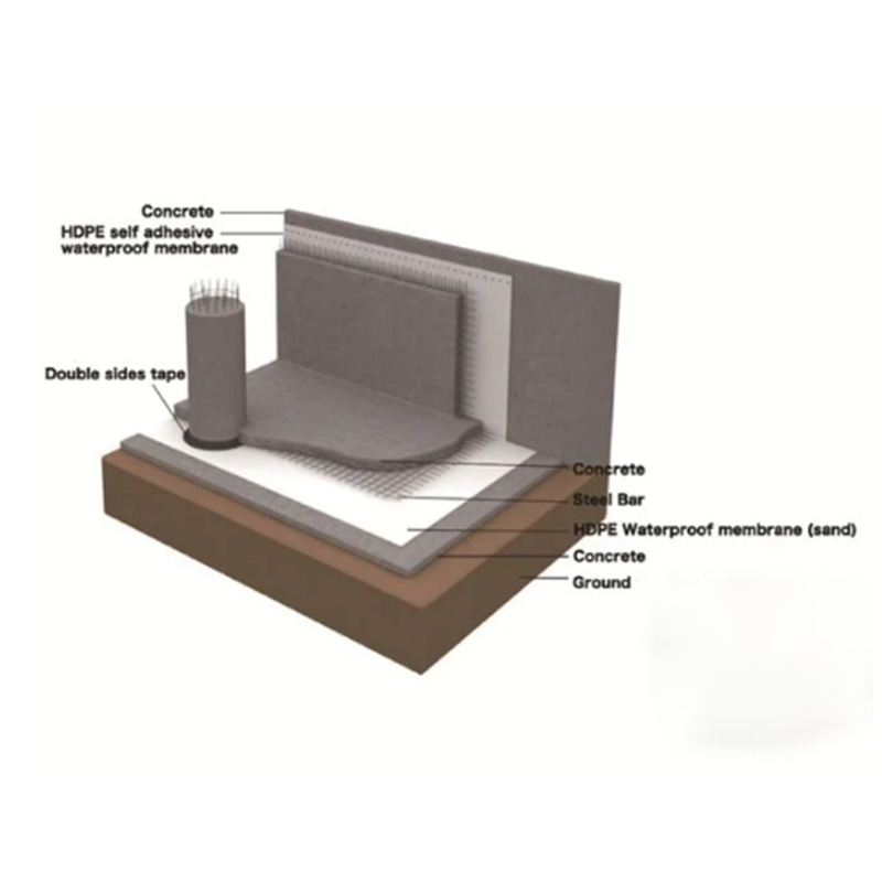 This is a Non-asphalt Based High-polymer Self-adhesive Waterproof Membrane(pre-laid)consisting of High -density Polyethylene,thermoplastic Polyolefin, Thermoplastic Elastomer High-performance Hot-MeltAdhesive Layer,weather-resistant lsolation Sand ,and Produced Through Special Coating Process.